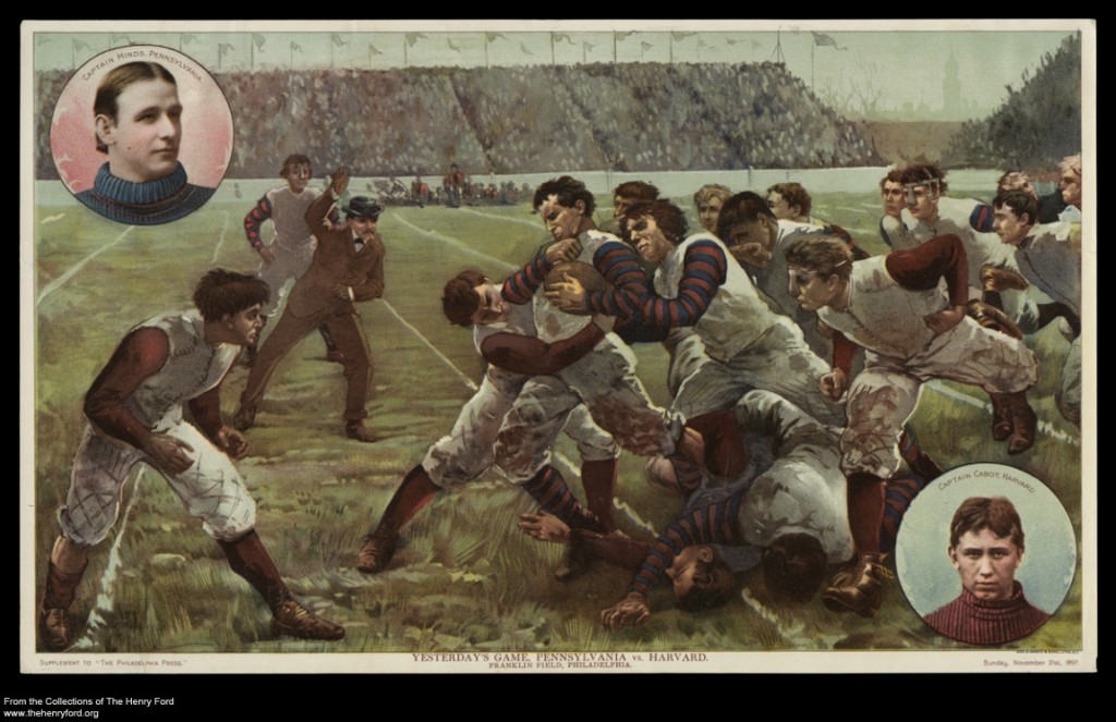 At first each college played by its own variations. Rules were minimal. The teams played “mob style,” with huge numbers of players on each side attempting to advance the ball to a goal on the opponents’ side of the field by any means necessary! It is easy to imagine how violent and dangerous this got.