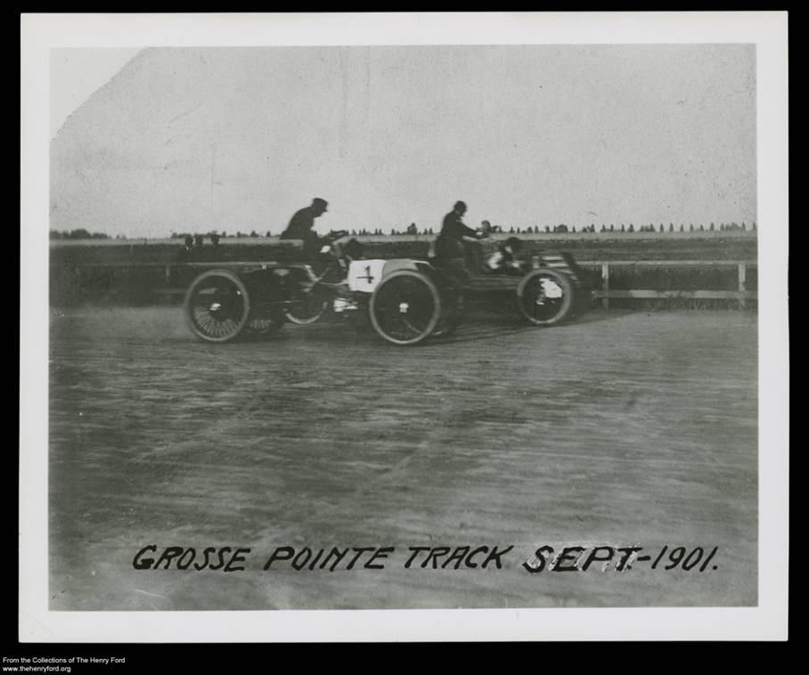 The thing most identified with Henry Ford is the Model T, a car introduced in 1908 that was reasonably priced, reliable, and effective on the bad roads of the day. Three sets of collections items help tell this story. On the Way to the Model T shares some artifacts that show how Henry’s career progressed, such as the 1896 Quadricycle, the first car Henry ever built, and a 1901 photograph showing the race (featured above) that helped Henry gain notoriety and financial backing for his auto ventures. The Model T set shows a few of the Model T’s in the collections of the Henry Ford, including an early 1909 version, and also shows how quickly the Model T was assimilated into all aspects of daily life, from rural families to ingenious work applications. Post-Model T covers many of Henry’s business activities following the Model T, including the introduction of the V-8 engine and war production at Willow Run.