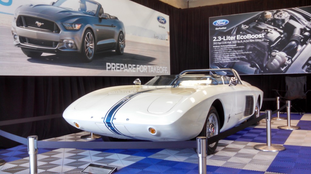 Our week began with Gordon McCall’s Motorworks Revival, a sort-of kickoff celebration held at the Monterey Jet Center on Wednesday, August 13. The event staff took full advantage of the airport setting – Mustang I was displayed in front of a P-51 Mustang fighter airplane. There were exotic supercars, over-the-top hot rods (including one powered by a Packard V-12 marine engine – yes, a boat engine), and even a few racing celebrities. We were especially pleased when Dan Gurney stopped by to say hello. Mr. Gurney drove Mustang I for Ford Motor Company at Watkins Glen in 1962, and he was happy to see “his” little roadster again.