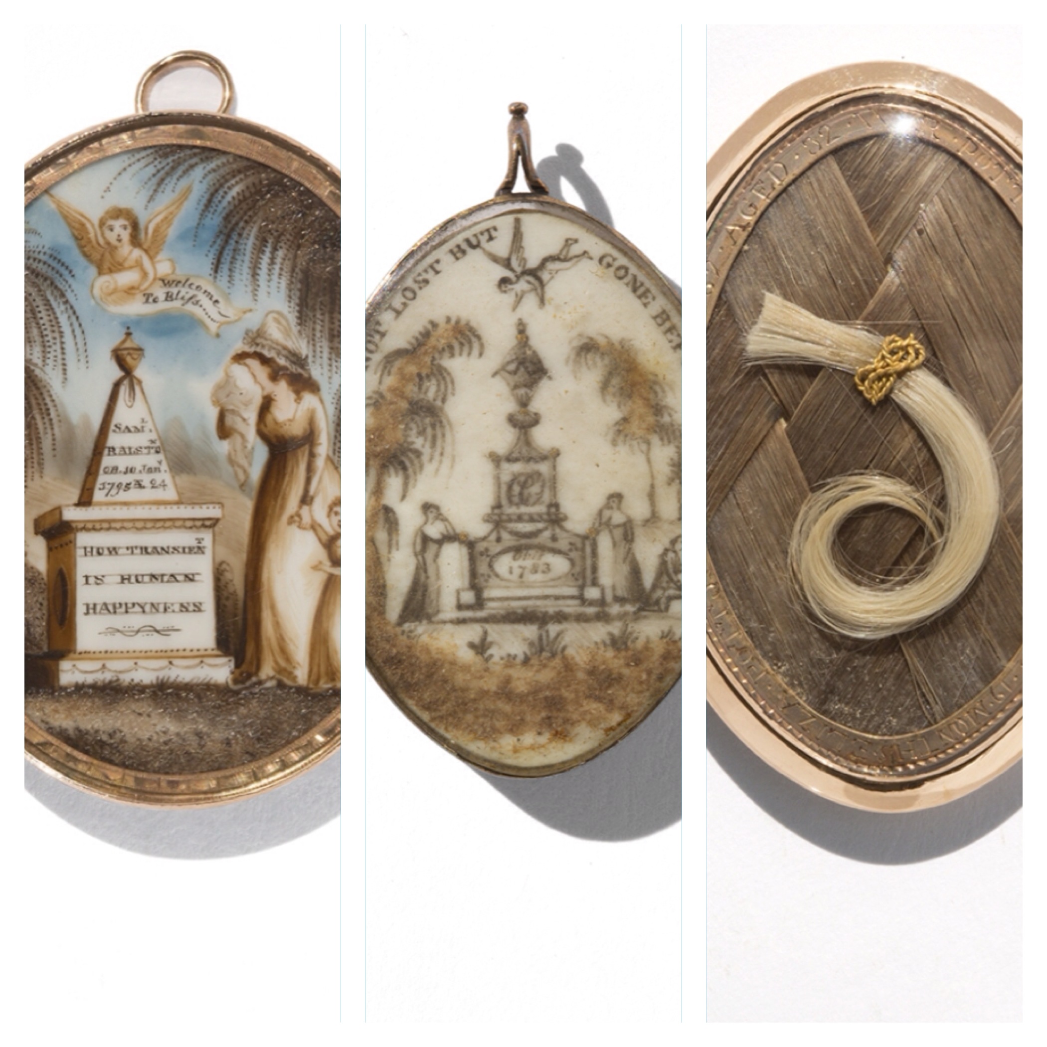 The pendant dedicated to Samuel Ralston, who died on 10 January 1795, might serve as a model mourning miniature – the front side shows the ubiquitous weeping woman holding a child by the hand. She mourns in front of a monument with a triangular top, surmounted by an urn. The monument base is inscribed, "How transient is human happyness [sic]." An angel floats in the sky above, carrying a scroll with the haunting epitaph, "Welcome to Bliss . . . . " The reverse side is equally revealing about the nature of these keepsakes. A glass-enclosed insert is filled with a woven snippet of the deceased's hair, another tangible remembrance. This was a common feature in many mourning pendants.