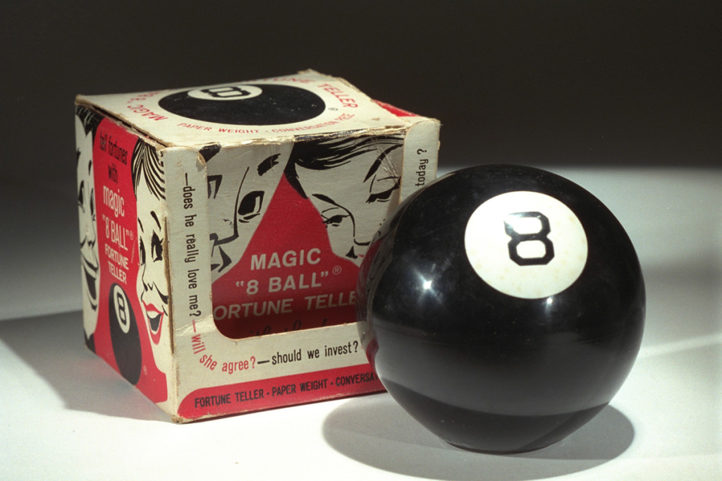This is novelty version of a crystal ball was introduced in 1946, at a time when forecasting the future was a popular pastime. How it worked: The ball is actually two separate halves glued together (then polished to help make the seam disappear). Inside is a plastic vial, affixed to one end and standing upright. About the size of a juice glass, the vial is filled with a blue liquid, which is made up of a combination of water, blue coloring, and propylene glycol, an antifreeze to keep the solution from turning solid during shipping. Floating in the liquid is a polyhedron, whose 20 sides bear 20 different answers in raised letters. The clear plastic cap that seals the cylinder not only assures that the blue solution won't leak out, but doubles as the little window through which you view your answers.