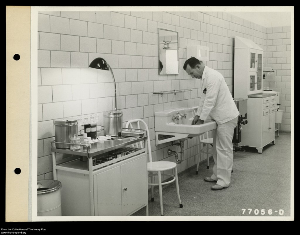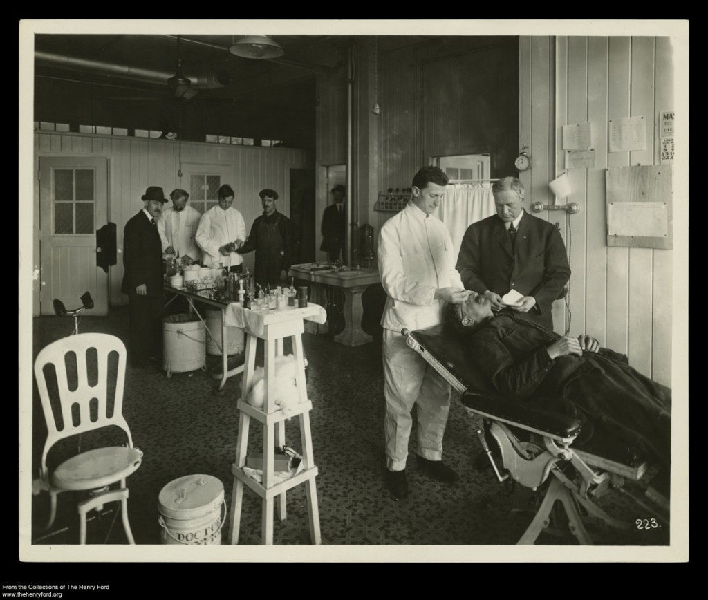 From “a bottle of liquid soap, a few bandages, and a pair of scissors” in a small wooden box by the timecards, the Ford Motor Company Medical Department grew to include over 100 physicians, assistants, and other employees. In 1914, Ford Motor Company instituted the five dollar day and with it a number of improvements to their programs for workers. One such program, was to expand and build up the Medical Department, first at Highland Park, where a 23-room state-of-the-art medical facility was built, and then expanding to the Rouge and other factories across the Ford empire. Let’s take a look at what the Medical Department looked like around 1916.