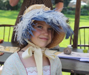 A young visitor tries on a feather embellished bonnet.