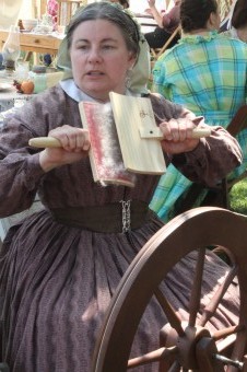Patty Giorlando demonstrates a spinning wheel, a skill she recently acquired participating in reenactments.