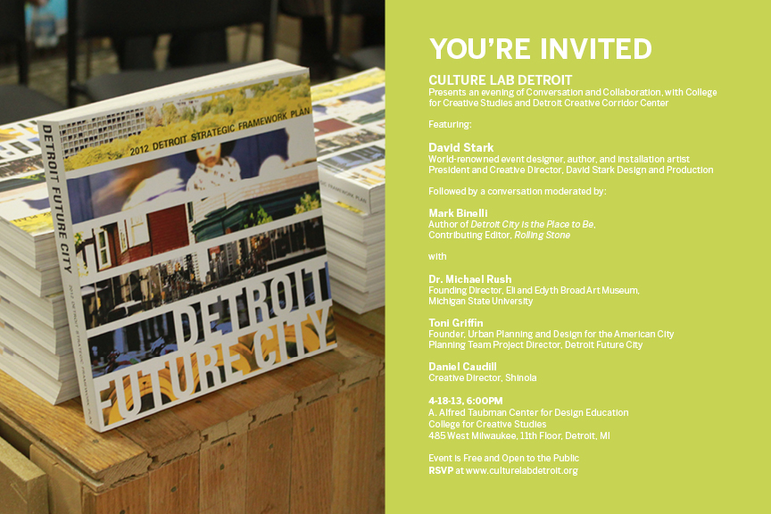 I hope you can join me in learning more about these new innovators and celebrating this surge of creativity and ideas on Thursday, April 18, at the College for Creative Studies for an evening of conversation and collaboration with my good friend David Stark. David is a world-renowned event designer, author, and installation artist. Joining David that evening will be Mark Binelli, Michael Rush, Toni Griffin, and Daniel Caudill. You can learn more about the event, hosted by Culture Lab Detroit, here.