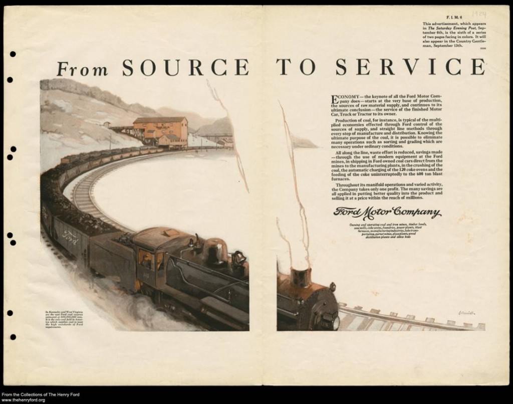 The items include a number of paintings, magazine advertisement proofs created from those (and other) paintings, and correspondence that formed an impressive ad campaign. The campaign itself consisted of 16 ads that ran in the Saturday Evening Post and other magazines in 1924 and 1925. The ads, two-page spreads that contained both visually arresting artwork and a significant amount of text, explained the backstory of the Ford company at a time when, as Marc Greuther, Chief Curator and Curator of Industry and Design at The Henry Ford, states, the company was at “a certain kind of pinnacle” with their signature product, the Model T, but “the product is slipping.”