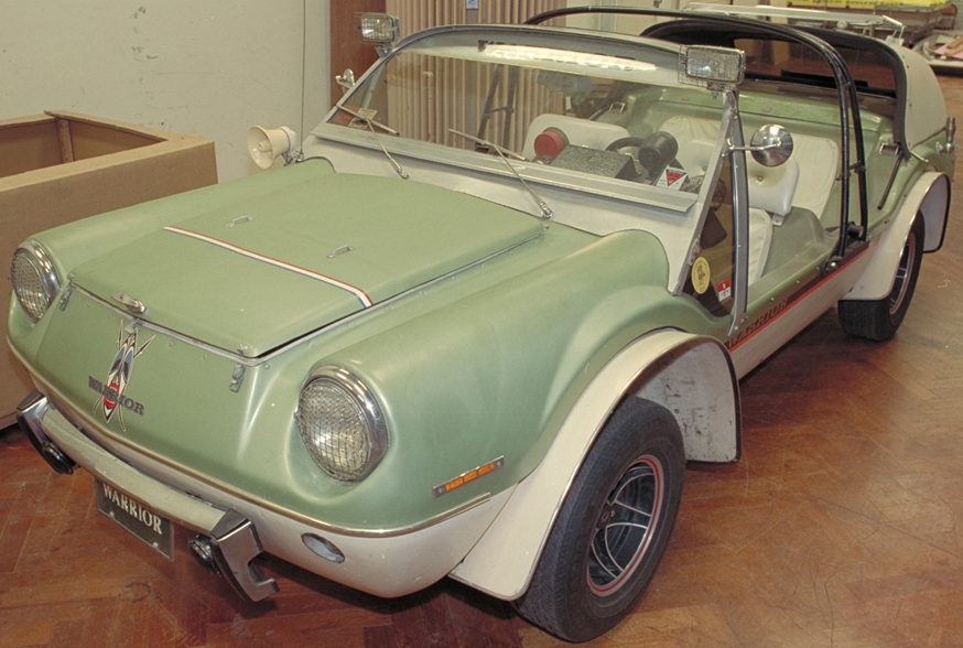 The prototype was modeled on the Renault R-10, a small four-door sedan. Indeed, the Warrior’s chassis came directly from a disassembled R-10. Base mechanical components, including the engine, were also incorporated. Renault already had a distribution system overseas, providing a ready-made parts supplier for Mr. Thompson’s customers. Mr. Thompson and Mr. Triplett designed and built the tools to form the sections of the body, which were then sent off to Uniroyal, who molded the Royalex plastic.