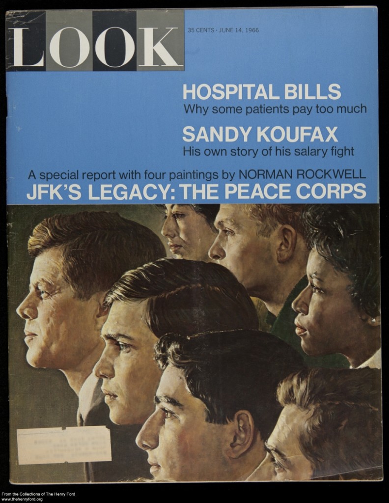 Kennedy viewed his vision for a Peace Corps as an opportunity for young Americans to spread hope and goodwill across the world while also serving as a new weapon against the Cold War. By 1964 this program—which had been established March 1, 1961—had received an all-time high of over 45,000 applications. In 1966, less than three years after President Kennedy’s tragic death, Look magazine commissioned Norman Rockwell to portray Kennedy’s Peace Corps legacy for the cover of its June 14, 1966 issue.