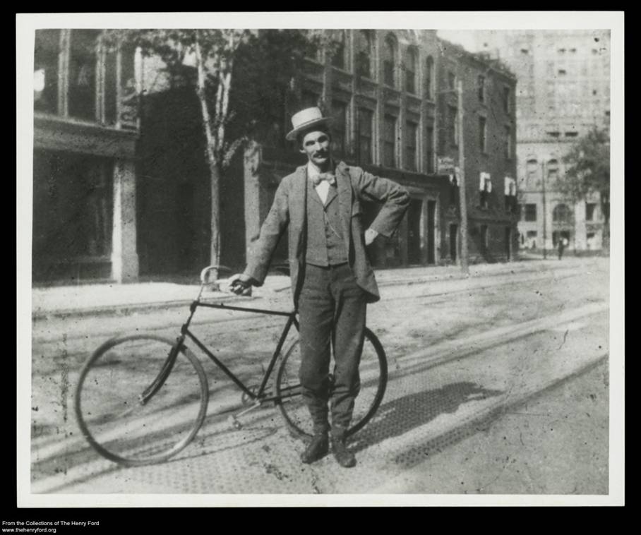 Henry Ford, then an engineer for the Edison Illuminating Company, with his bicycle and his moustache, Detroit, Michigan, 1893 (THF95021).