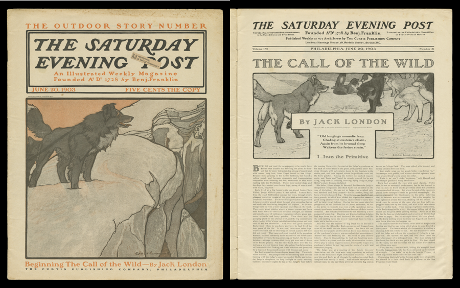 The Call of the Wild was first published in The Saturday Evening Post, a popular weekly magazine that featured a variety of content including articles on current events, editorials, illustrations, cartoons, poetry, and fiction. The magazine paid Jack London a sum of $750 for his story, the equivalent of almost $20,000 today. The Call of the Wild was published in five consecutive issues from June 20, 1903 to July 18, 1903. The first two of these issues are held in the collections of The Henry Ford, including the initial issue which features The Call of the Wild on the cover.
