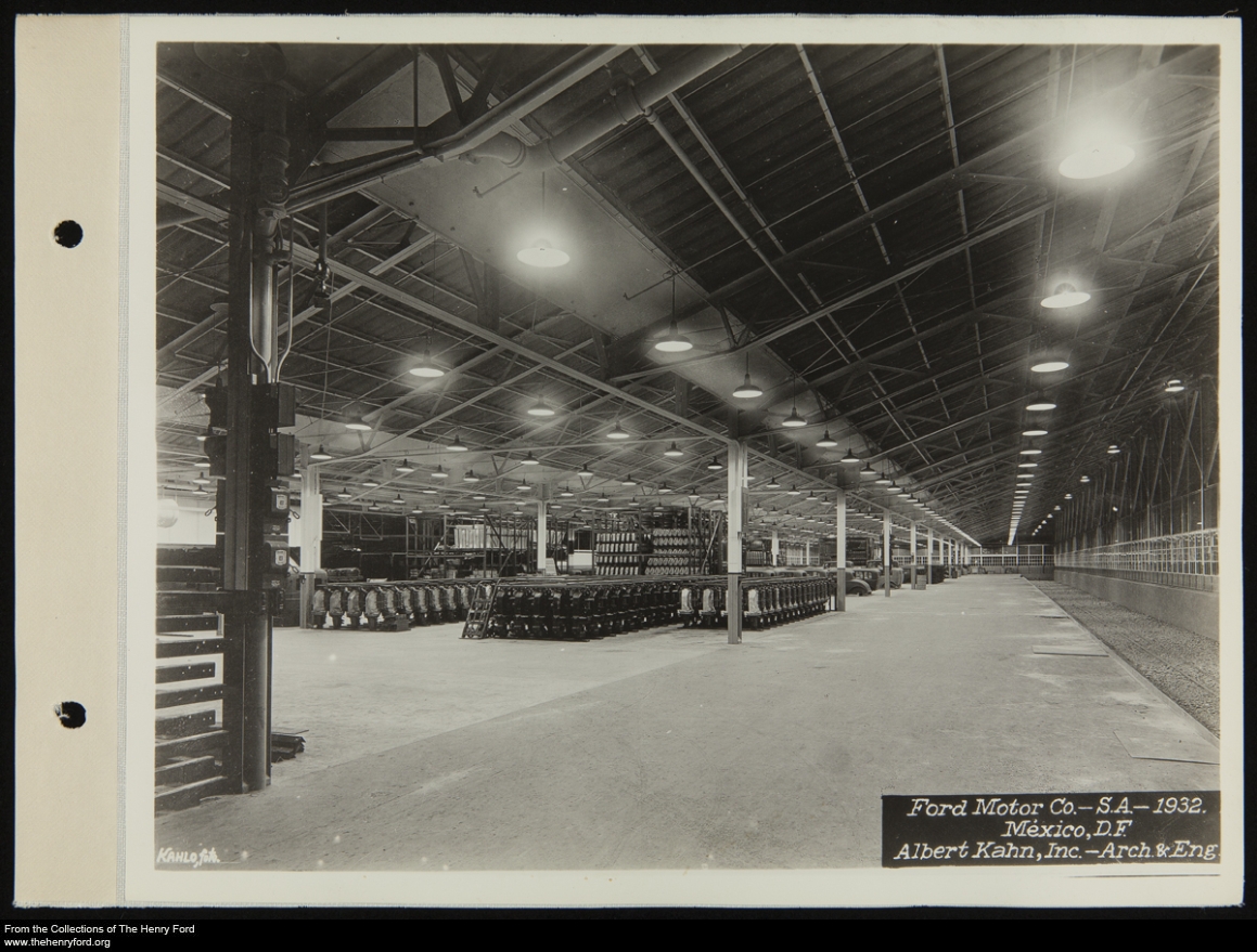 As part of our collaboration with the Detroit Institute of Arts (DIA) and other Detroit-area community organizations to provide additional context for the Diego Rivera and Frida Kahlo in Detroit exhibit at the DIA through July 12, 2015, The Henry Ford has been digitizing parts of our collection that relate to Diego Rivera, Frida Kahlo, and their relationship with the Ford family and Ford Motor Company. We ran across a couple dozen 1932 photographs, including this one, of the Ford Motor Company Mexico City plant, all marked “Kahlo Foto,” and wondered whether these might be the work of Frida Kahlo’s father Guillermo Kahlo. An essay in the exhibit catalog by Diego Rivera’s grandson Juan Rafael Coronel Rivera notes “Don Guillermo was considered the finest architecture photographer in Mexico, a master in the field…. Diego respected Don Guillermo … for his studies of industrial machinery: Don Guillermo recorded the day-to-day modern development of the country; every factory and every major engine installation became the subject matter of his photographs, which were published in the Mexican press as an indisputable symbol of the nation’s advancing progress.” We haven’t yet found any further information about the genesis of these images, but it seems likely, given the labels on the images, Guillermo Kahlo’s architectural photography background, and the year the images were taken (the same year Rivera started work on the Detroit Industry murals at the DIA), that these images have a tie to Frida and Diego’s time in Detroit and relationship with the Fords. Visit our collections website to see all of these images, as well as the other related material we’ve digitized.