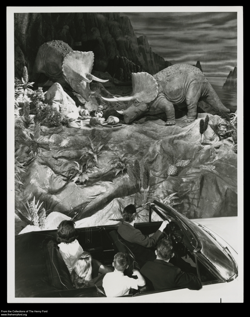 Emerging from this time tunnel, guests found themselves in “a dim primeval place of strange sounds and sights.” Their cars moved past several gatherings of “prehistoric monsters”—some engaged in mortal combat, others combing the rugged and swampy terrain for food. But, within moments, climate and plant life shifted and Man made his appearance. Groups of cavemen could be seen discovering fire, painting on cave walls, fighting off vicious beasts, using stone as a tool, and—in a final vignette—using the wheel.