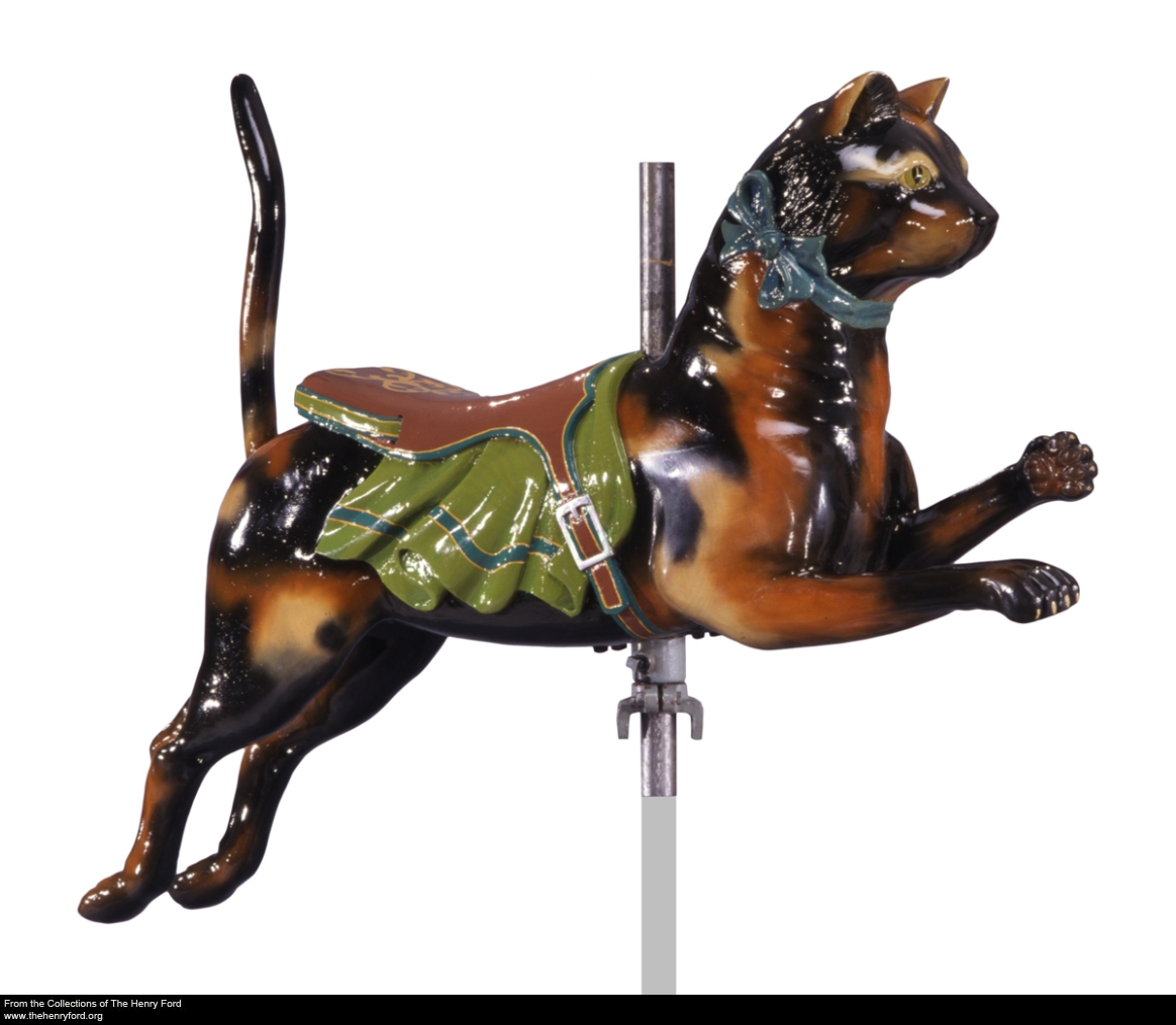 The April 15 opening date of Greenfield Village is growing ever closer, and while you will have to wait just a bit longer to walk the streets and visit the buildings in person, you can now see a few of the Herschell-Spillman Carousel’s animals, like this beribboned cat, in our online collections. To find out if your favorite (perhaps a dog, goat, or patriotically outfitted horse?) has been added, follow this link to see what we’ve digitized.