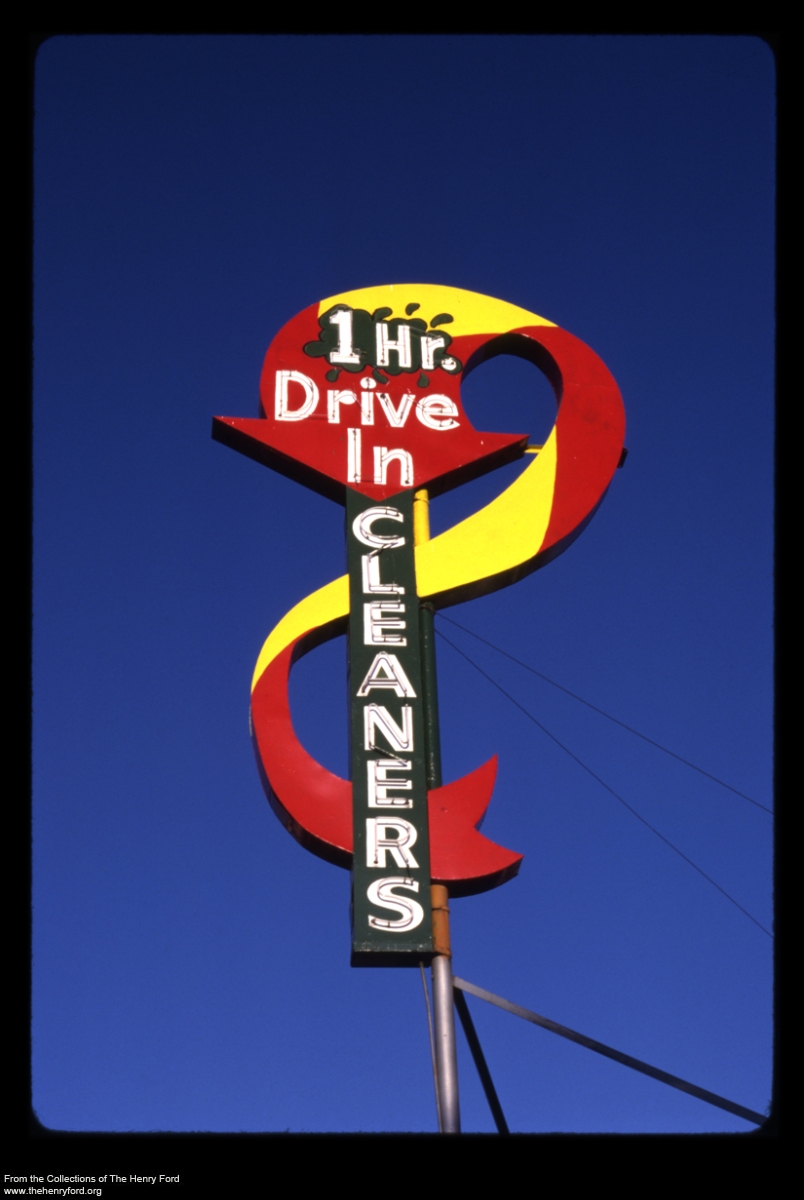 John Margolies has spent decades traveling the roads of America and photographing roadside attractions, restaurants, shops, and motels. Many of them are in varying states of abandonment and decline, but harken back to the excitement of 20th century road trips and the unique commercial designs they spawned. The Henry Ford recently acquired about 1,500 slides by John Margolies, and is digitizing selections by Chief Curator and Curator of Industry & Design Marc Greuther, including this drive-in cleaners’ sign photographed in 1987 in Oregon. View more selections from the Margolies collection on our collections website.