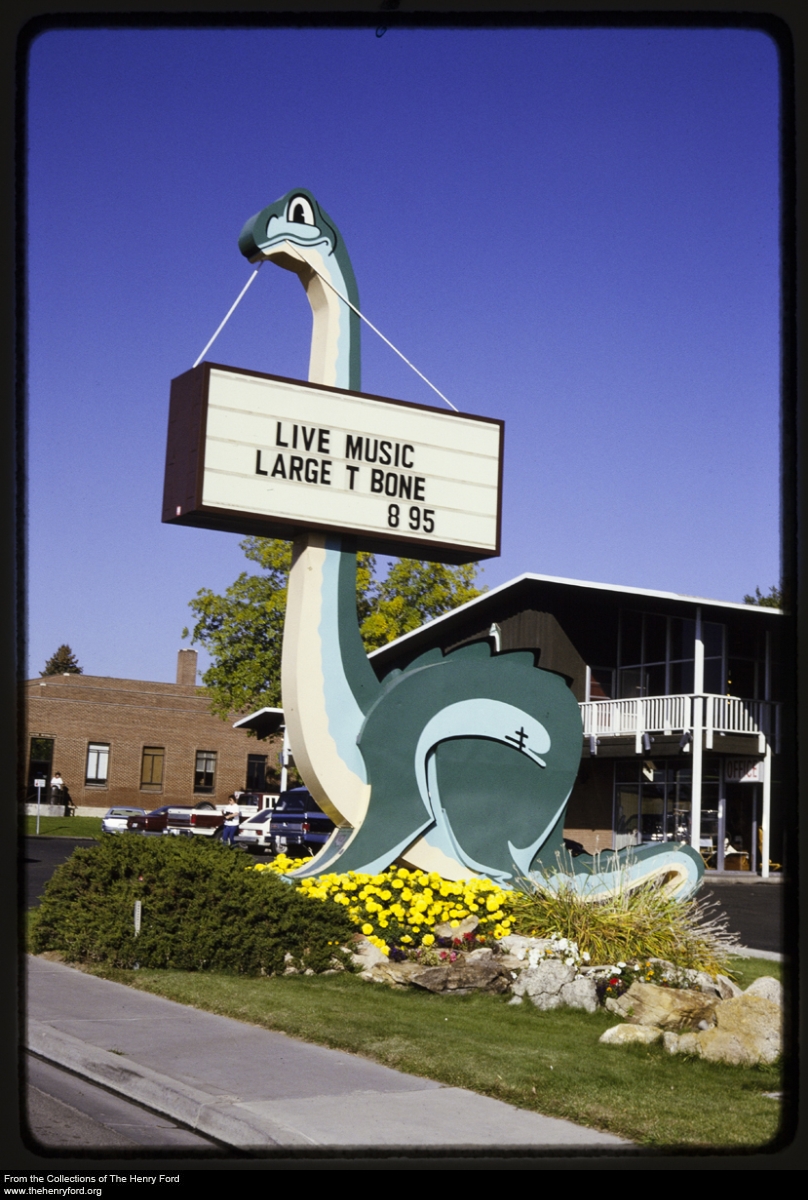 John Margolies spent decades traveling the United States and photographing roadside attractions, restaurants, shops, and motels, with a particular focus on interesting or quirky shapes and signage.  Many of the places he photographed are in varying states of abandonment and decline, but harken back to the excitement of the golden era of road trips and the unique commercial designs they spawned.  Last year, The Henry Ford acquired about 1500 slides by John Margolies, and a little later this year, we will be putting on an exhibit of selected material, transformed from 35mm slide format into art prints.  If you’d like to get a jump on the exhibit, you can currently view over 120 recently digitized Margolies slides on our collections website (including, in most cases, the slide mounts with John Margolies’s hand-written notes).  Some of these images—perhaps this dinosaur offering up live music and a really good deal on a large t-bone—will be featured within the exhibit.