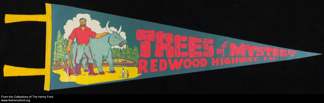 A couple of weeks ago on the blog, we shared slides from the John Margolies Roadside America collection, newly digitized in anticipation of a Margolies exhibit coming to The Henry Ford later this year.  However, John Margolies did not only take photographs of interesting places he encountered on the road; he also collected related items.  We’ve just digitized about 300 pennants Margolies collected, representing various cities, states, parks, zoos, circuses, beaches, landmarks, and intriguing roadside attractions.  On this colorful example, Paul Bunyan and Babe the Blue Ox invite you to visit the Trees of Mystery along the Redwood Highway, California.  To find out if your hometown or favorite childhood attraction is represented, visit our collections website and peruse all the digitized pennants—and see if you can spot any of them in the exhibit later this year!