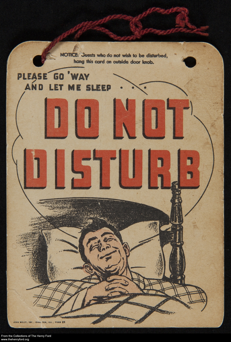 Over the last couple of months, we’ve digitized a couple of groupings from the John Margolies Roadside America collection: slides and travel-related pennants, both documenting the strange and interesting sights one would have found along the American roadside in the mid-20th century. This week we’ve added one more category from the same collection: do-not-disturb signs from hotels and motels, collected by John Margolies and mostly dating between 1920 and 1970.  The example shown here, likely from the late 1930s or 1940s, advises hotel staff to “go ‘way and let me sleep.” Selections from this collection will be featured in the upcoming Margolies exhibit in the Henry Ford Museum a bit later this year. In the meantime, visit our collections website to browse additional “do not disturb” signs.