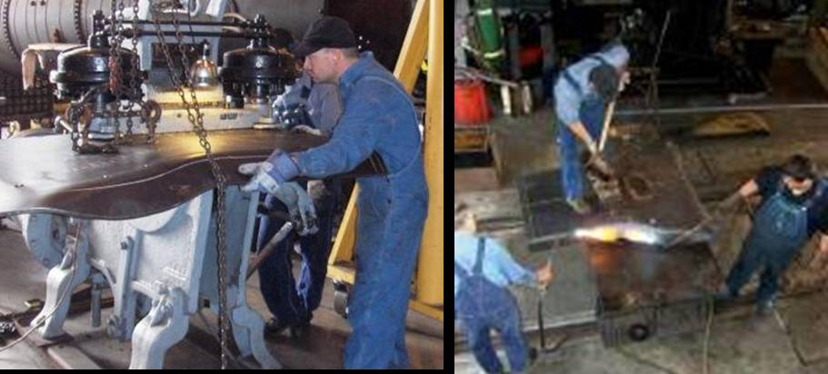 To facilitate the hand forming an approximately 1.5 inch thick metal die had to be fabricated. This was done by an outside company to Train Operations developed drawings. The partially formed steel sheet was then rigidly attached to the die and the remaining forming was done after the immediate area being formed was heated to red hot by acetylene torches. The heated portion could then be formed by the use of special hammers. These hammers were made of reinforced hard wood that would not put dent marks in the metal when it struck the red hot steel. Dent marks would structurally weaken the metal. The upper corners of the sheet had be cut at the centerline of the curve so that, when formed, there would be a smooth joint that could be welded with integrity.