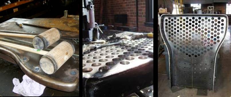 This picture shows the thickness of the metal sheet that had to be formed by hand. Right (photo by Shirley Damps), The formed and drilled tube sheet is ready to be welded to the back of the boiler. The larger (upper) holes are for the heat tubes and the lower holes are for the stay bolts.