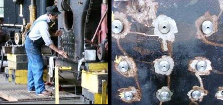 Once the stay bolts are installed (above) the exposed ends are “upset” like a rivet so they are sealed and fixed into position. When the stay bolt is fabricated it is drilled down its center (above)so that if it cracks or breaks during service, a small trail of water or rust will appear on the head indicating an internal failure of the stay bolt.