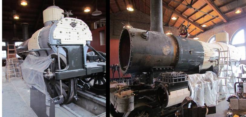 Once the components of the boiler were installed it was painted with high temperature epoxy paint and the insulation blocks began to be installed. The “calcium silicate” insulator blocks (above) replaced the asbestos removed in 1997 and was necessary to help keep heat in the boiler and provide an insulated barrier to protect the “jacketing.” The “jacketing” was decorative but primarily served to keep the insulation blocks in place, heat inside the boiler and protect train personnel.