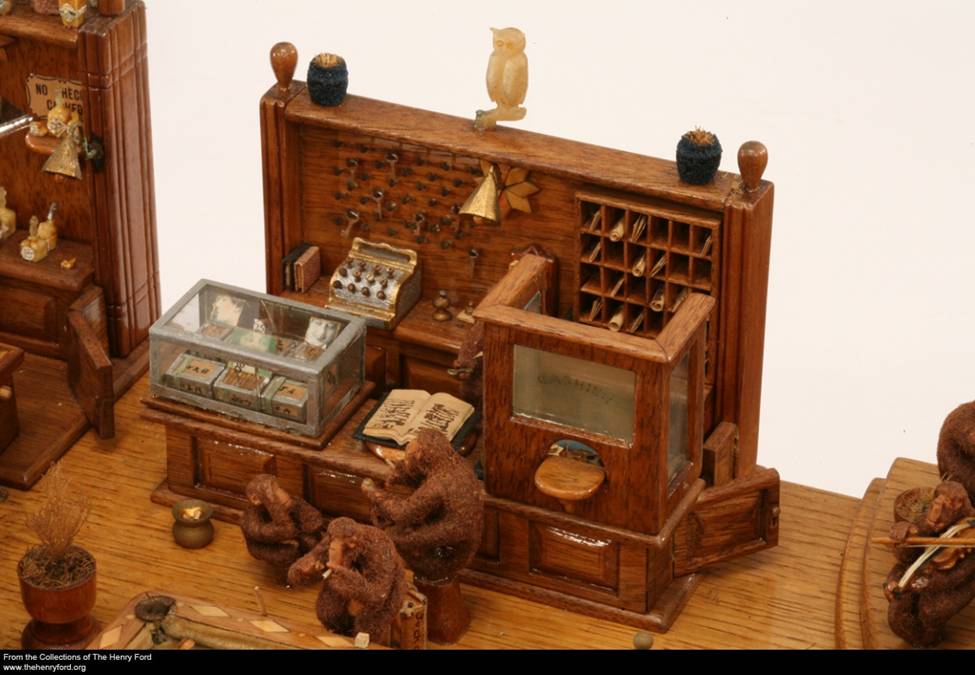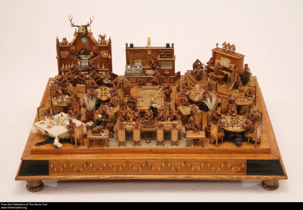 Perhaps surprisingly, monkey bars were created by other prisoners in the early part of the 20th century (another one was featured on Antiques Roadshow in 2007, for example), but the one in our collection is truly amazing in its tiny details, from the inlaid wood tables, to the cigar ash piling up wherever monkeys are smoking, to the see-no-evil, hear-no-evil, speak-no-evil monkey statuettes on top of the piano. Wherever you look in the great detail shots captured by our photographer, you see something new and striking.