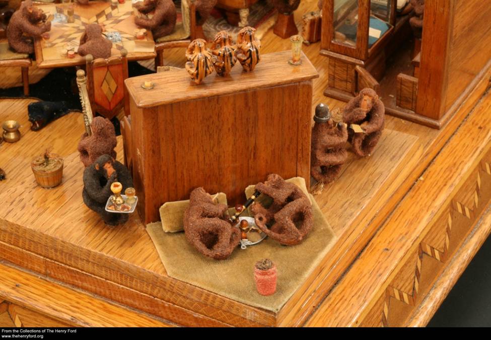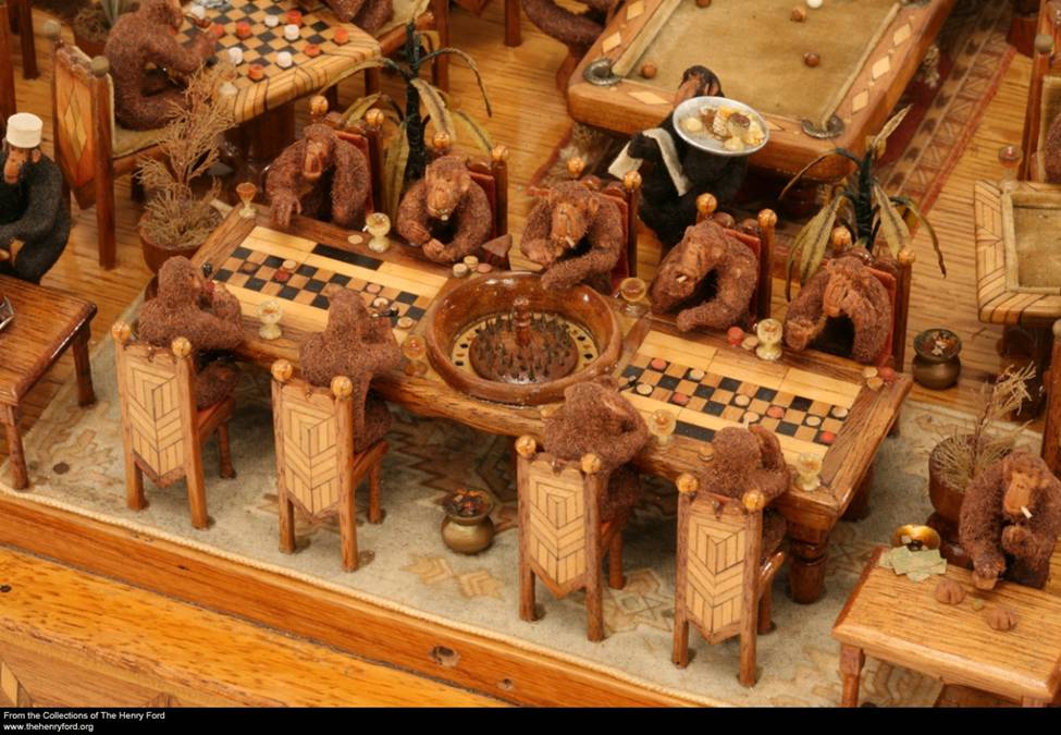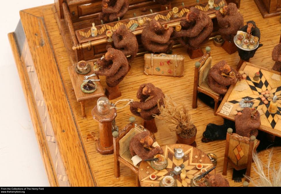 Culhane intended the diorama to depict many of the worldly pitfalls that had put him and his fellow inmates on a path to prison. The Bar is chock full of monkeys engaged in all kinds of rambunctious activities—drinking alcohol, gluttonous eating, smoking (cigarettes, cigars, and opium), gambling and gaming in many forms (craps, roulette, checkers, shell game, and cards), playing music, monitoring the stock market via a ticker, and even paying off a policemonkey. Clearly some of the monkeys are ready to check into (or out of) the associated hotel, as they have their suitcases with them and keys and mail are visible behind the desk.