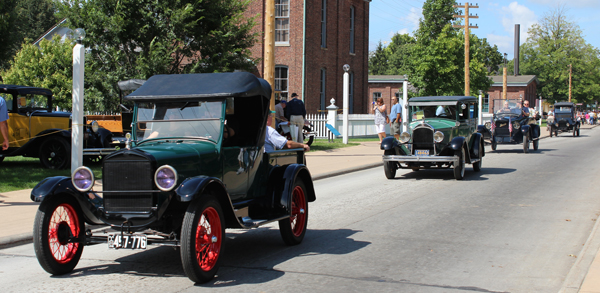A 1931 Ford Model A leads a line of early cars and bicycles through Greenfield Village.