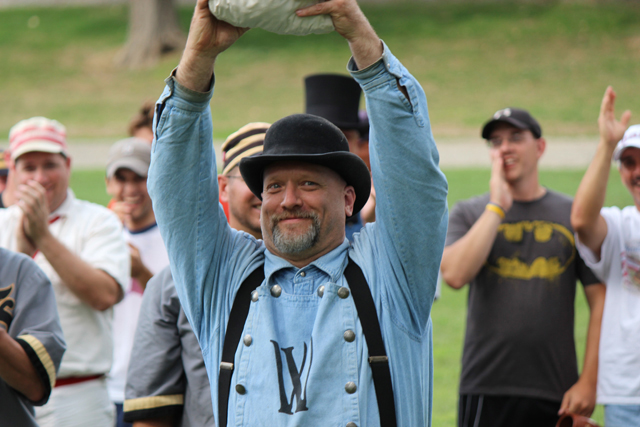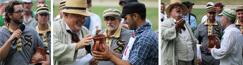 Left: Saginaw Old Golds’ captain Adam "Squints" McCauley thanks teams and guests after accepting the 2012 World Tournament of Historic Base Ball take home championship trophy. Center: Rudy “Swamp Fox” Frias, Jr., captain of the Columbus Capitals, accepts the prize for runner-up. Right: Is it raining? Mark “Marker” Cammock accepts a trophy on behalf of the Forest City BBC – after his team drenched him with a bucket of water.