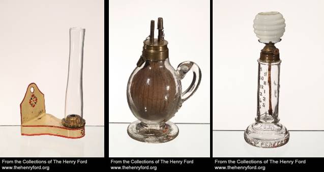 Whale Oil Wall Sconce, 1840-1860 (Object ID 62.70.511); India Rubber Safety Lamp, 1855 (Object ID 00.919.3); Grand-Val's Perfect Time Indicator Lamp, 1880 (Object ID 66.7.24)
