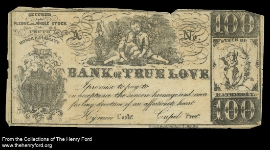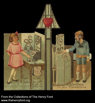 This year I searched our collections for more selections of valentines and found some surprises. I happened to find several which struck me as a quite unique. One is designed to look like a promissory note, picture above, from a bank in the 1850s. Another is a cutout card featuring kids playing with radio equipment in the 1920s - then the latest technology! The third example is a card that folds out to form an elaborate 3D tissue bell.