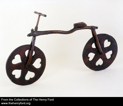 I think that any search for Valentine's Day cards needs to include heart shapes as a design motif. In addition to the cards, I expected to find jewelry, dishes and quilts to have heart motifs, but here's something unexpected: a forerunner of the bicycle made with heart shapes cut out of the wooden wheels.