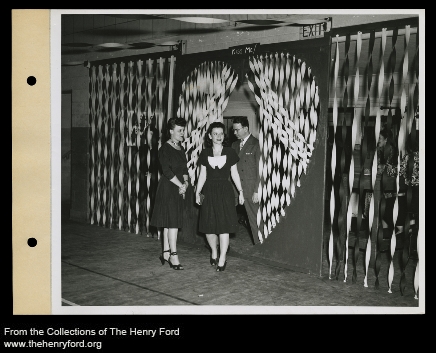 Then I came across this photo of a Valentine's Day Party. It is identified as a Girls' Club Valentine Dance, but they look like ladies and a gentleman to me. The room is decorated with crepe paper streamers and a large heart-shaped doorway. The sign above the doorway reads, "Kiss Me!"