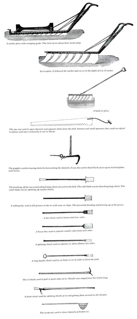 Some of the ice harvesters worked as farmers or fishermen in warmer months; some were imported from nearby cities to work the ice fields. Whatever their makeup, when ice harvesting crews gathered in January and February, they faced a complex and sometimes dangerous challenge. First, the ice had to be scraped clear of snow and, when the surface was too rough to be cut, planed smooth. Workers bored holes to measure the thickness of the ice, and then used a marker or groover to etch a grid of rectangles across the ice field. Next, an ice plow followed these lines, cutting about two-thirds of the way into the ice. If the ice was going to be used locally, the rectangular blocks of ice – called “cakes” – were chipped off and loaded onto wagons or sleighs for direct delivery. Otherwise, harvesters broke off large sections of the grooved ice field using saws and other hand tools. Workers guided these rafts of ice through a channel, where men broke the sheets into individual cakes and fed them up an elevator conveyor into an ice house. There, workers arranged the ice cakes into layers for storage and later delivery. If the ice house was located along the railway – and many were – blocks of ice could be loaded directly into refrigerated rail cars.