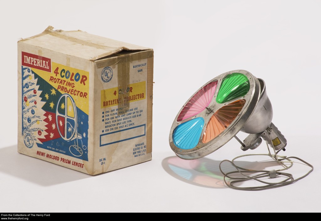 The Aluminum Specialty Company of Manitowoc, Wisconsin, is credited with starting the craze for aluminum Christmas trees—producing and selling more than one million of these trees between 1959 and 1969. Their flagship tree was called “Evergleam”—an ironic play on the word “Evergreen.” Once other aluminum manufacturers caught on to the popularity of these trees, they produced their own versions.  The additional purchase of a color wheel produced a delightful variety of colors on the tree’s silvery needles and branches.