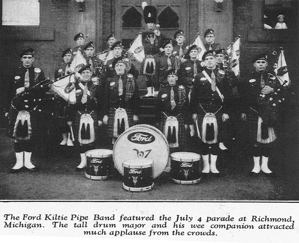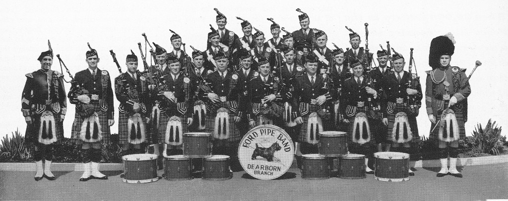 Henry Ford was a lover of music, so it should come as no surprise that he sponsored a number of employee bands, one of which was a group of Scottish and Irish pipers and drummers. The Ford Pipe Band, also known as the Ford Kiltie Band, was formed in 1932, with most of the members coming from the St. Andrew’s Pipe Band in Detroit. It started when Alexander Adams, the drum major, who was Edsel Ford’s bodyguard, began recruiting other members of the band to come work at Ford. The Pipe Major, Hector McGinnis, bass drummer, William Riddock, and pipers, James Cullen and Donald McPhee all worked in Plant Protection, with many of the other members working in departments across the company.