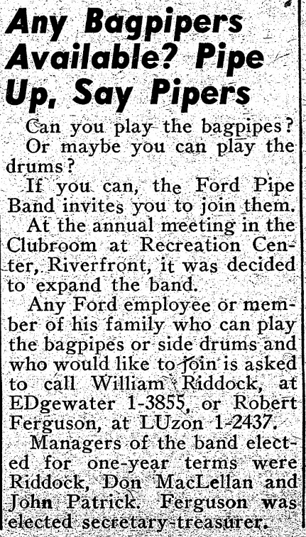 Ford Motor Company provided members a practice space at the Highland Park plant, and gave the pipers and drummers paid time off for performances and competitions as well as credited work time for all travel. The band consisted of first-rate musicians, many of the members had been regimental pipers and drummers in the Scots Guard during WWI and had continued to play in local bands in the Detroit area. During the peak of the band in 1934-36 as many as 20 pipers and drummers played for Ford Motor Company.