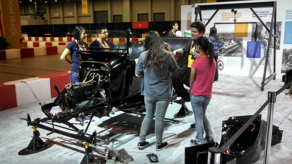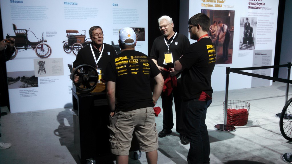 Ah, but what of The Henry Ford’s role? We were proud to partner with Shell in a series of exhibits open to the public, free of charge, for the duration of the event. We examined steam, electric and gasoline power in early automobiles in a display that included a working replica of Henry Ford’s 1893 “Kitchen Sink” Engine, a replica of Ford’s 1896 Quadricycle, and our 1922 Detroit Electric coupe. In another exhibit, we looked at the traits, inspirations and processes that led Henry Ford to build the Model T (complete with our “Build a Model T” activity, relocated for the weekend from Henry Ford Museum) and compared them with the same qualities found in the Eco-marathon teams. We displayed a high-mileage concept car from our collection, the X Prize-winning 2010 Edison2. We also created a sort-of lounge area where students and visitors could watch selected clips from The Henry Ford’s Innovation Nation. Finally, we passed out those tape-on-the-bridge “geek glasses” we use to promote Maker Faire because, in a genuine sense, the Eco-marathon students are makers.