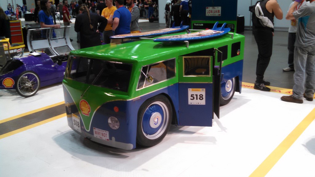 Walking around Cobo Center, I saw a remarkable variety of designs – some of which would stand up against anything a major manufacturer might build. While the Prototypes were all sleek and slender, I think I preferred the Urban Concepts. Students let their imaginations run wild, often using production vehicles as models. (I saw a couple of Volkswagen van homages – one complete with Scooby Doo in the rear window.) But the inspection process was serious business. Officials reviewed every car to confirm that fire extinguishers were aboard, that drivers could escape unassisted in ten seconds or less, that engine noise levels were within tolerable limits, and any number of other requirements. More than a few teams failed to make it past this step.
