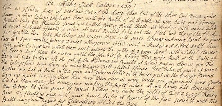 Colonial housewives used recipes handed down from mother to daughter by word of mouth. Women who could read and write might copy down their family recipes in manuscript cookbooks like this one.